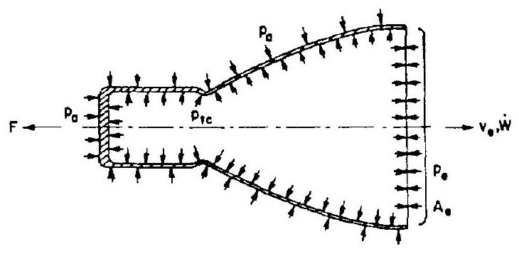 Let us first assume that the chamber is operated at an ambient pressure (high-altitude condition). Then, the net force acting on the gas in the chamber is the sum of the reactions from the chamber walls and of the reaction of the absolute gas pressure at the exit. These two reaction forces are opposed (fig. 1-1). According to the momentum theorem, the net force on the gas must be equal to the momentum flux out of the chamber: