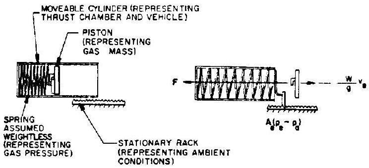 The following model may extend the understanding of the nature of the terms which compose equation (1-6). Let us assume we have a movable cylinder (representing the thrust chamber and vehicle mass), a spring (representing gas pressure), a piston (representing the gas mass), and a stationary rack (representing ambient conditions) (fig. 1-2).