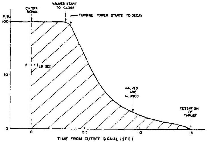 It is obvious that a prompt and repeatable execution of the cutoff signal is imperative. However, for several reasons, it is impossible to effect a truly instantaneous thrust cessation: time is required to sense and then transmit the cutoff signal; closing of valves requires a finite time; structural (hydraulic hammer) considerations are superimposed; residual propellants below the valves have an effect. Figure 2-2 shows a typical thrust decay diagram.
