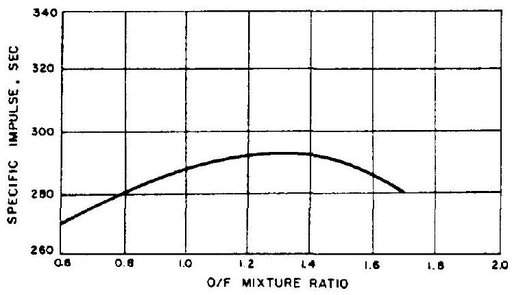 The lower the molecular weight, the higher the exhaust velocity, other things being equal. Analytical and experimental investigations will determine the optimum point of balance between energy release (heat) and composition (molecular weight) of the gas, a portion of which will consist of gasified but unburnt propellants. The optimum point may also be affected by- (1) Stay time of the burning gas in the combustion chamber.-Stay time is a function of combustion chamber volume and of gas volumetric flow rate. Complete combustion, even though desirable, requires a finite time which is not available unless the chamber is relatively large, and correspondingly heavy. A compromise in chamber size, therefore, is often made. This leaves unburned a small percentage even of those propellants entering the nozzle, which could have burned given sufficient time (chamber volume). This percentage must be considered for accurate determination and optimization of the composition of the combustion gases and when optimizing the gas properties with energy release and system weight. (2) Cooling considerations.-The temperatures resulting from stoichiometric or nearstoichiometric mixture ratios, dependent on propellant type, may impose severe demands on the chamber-wall cooling system. A lower temperature, therefore, may be desired and obtained by selecting a suitable ratio. Once the optimum mixture ratio has been determined for a given engine system, based on the major factors just discussed, it is obvious that deviations from it would result in engine performance penalties. Since the vehicle powered by an engine will have been sized and tanked to conform with the specified engine mixture ratio, it is important to know that deviations will also result in reduced vehicle performance, namely: (1) Reduced engine duration, due to premature exhaustion of one of the propellants (2) Reduced mass ratio, due to excessive residual amounts of the other propellant (increased burnout weight) Since the relationship between engine performance ( ) and mixture ratio for many systems is usually relatively flat near the optimum point (fig. 2-3), the effects from duration and burnout weight may well be the most influential ones for vehicle range.