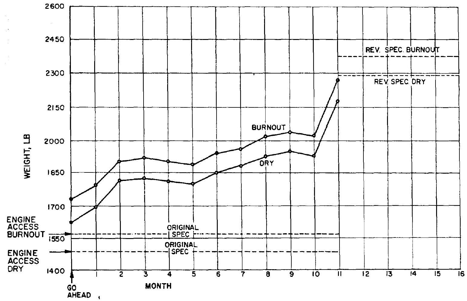 Because of the importance of weight control, rocket engine manufacturers employ engineers specifically in charge of this area. Table 2-1 shows a typical weight progress form, as it is used by the Rocketdyne Division of North Amercan Aviation. It is revised and reissued periodically. Thus it becomes a useful tool to raise early danger warnings. In our arbitrary example a slight underweight is shown. However, the table also shows that the data are based almost entirely on estimated and calculated figures, rather than on actual weighing results. This is characteristic for the earlier phases of design and development of a rocket engine. More often than not, the weight advantage will disappear gradually as the design firms up; then the squeeze will be on. For convenient display of the weight tendencies over time, a graph such as shown in figure will be useful.