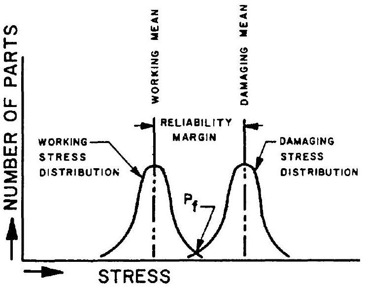 The deviations from the mean working stress result mainly from variations in the dimensions of the part, and from operational and environmental conditions. The distribution about the mean damaging stress results from variations in material properties, fabrication processes, quality control and maintenance practices. The area , where the two distributions overlap represents the probability of failure, or unreliability.