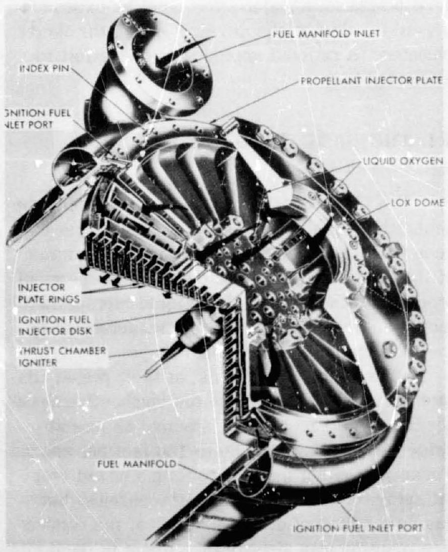 Figures 4-1 and illustrate a typical liquid bipropellant rocket engine thrust chamber assembly. The illustrated thrust chamber assembly is composed of four major subassemblies or basic elements; namely, thrust chamber body, injector, liquid oxygen dome, and igniter.