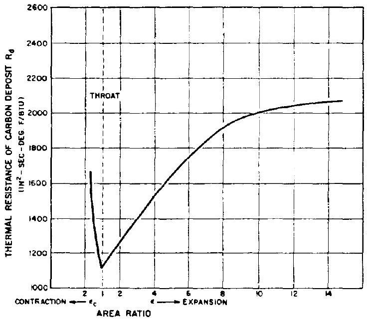 The experimental data of figure 4-25 can be used to determine the values of thermal resistance , for the carbon deposit. The thermal resistances are , and for points at the combustion chamber, the throat, and the exit nozzle area ratio of .