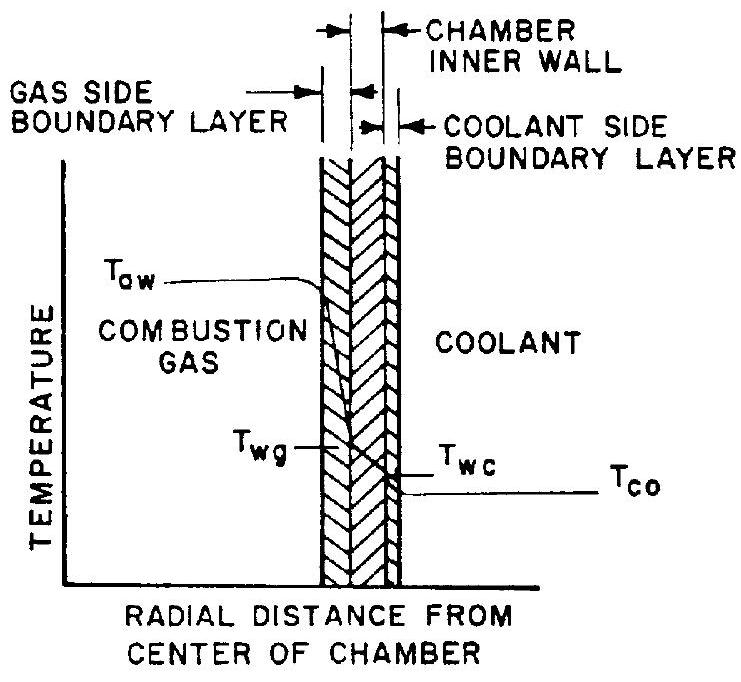 Assume a station in the thrust chamber with gas temperature and coolant bulk temperature . Referring to equation 4-21, it is seen that the heat flux , which must be the same through all layers, is a function of the temperatures, and of overall heat transfer coefficient . The value of is composed of the individual coefficients for the boundary layers and the chamber metal wall (eq. 4-22). The smaller , the smaller is . However, it is one of the major design goals to keep coefficient low, but heat transfer coefficient and conductivity high, in relation to . Since the temperature differentials are inversely proportional to the heat-transfer coefficients of the heat flow paths, the temperature drop will then be steepest between hot gas and inner chamber wall. The effect is analogous to voltage drops along resistors in electrical circuits.