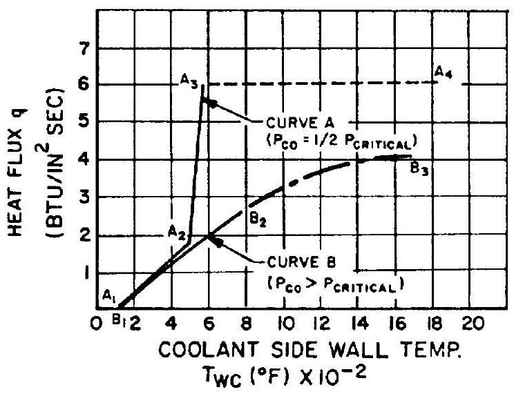 Curve B indicates the heat transfer behavior of a coolant above critical pressure. Since no boiling can occur, the wall temperature continually increases with increasing heat flux. Line represents the heat-transfer region, when the wall temperature is below the coolant critical temperature. The heat-transfer coefficient remains essentially constant. As the wall temperature reaches the critical temperature and higher, a gradual transition to a stable supercritical vapor-film boundary layer begins, which results in somewhat lower heat-transfer coefficients. Line represents the heat transfer in this region. Wall failure temperatures are usually reached at lower temperatures when the coolant is above the critical pressure than when it is below it. Where possible, a coolant operating pressure between 0.3 to 0.7 of critical pressure should be used to take advantage of the high heat-transfer coefficients available with nucleate boiling. However, in most systems, particularly those which are fed from a turbopump, the cooling jacket pressure, which is equal to or larger than the sum of chamber pressure and injection pressure, is supercritical. For the nonboiling subcritical temperature regions of both, subcritical and supercritical coolant pressures ( and in fig. 4-27), the relationship between wall temperature and heat flux, which depends on the heat transfer coefficient , can be predicted with sufficient accuracy for design purposes with the help of the Sieder-Tate equation (eq. 4-23) for turbulent heat transfer to liquids flowing in channels: