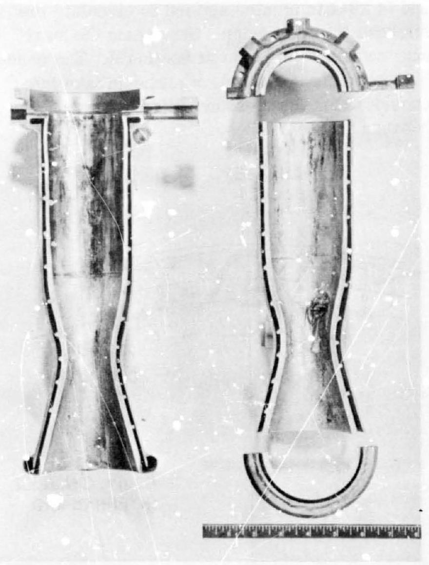 Figure 4-28.-Coaxial shell tarust chamber cutaway. Note overheated and burnt-through spot on chamber wall.