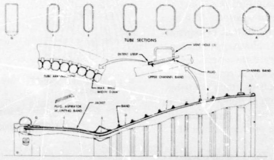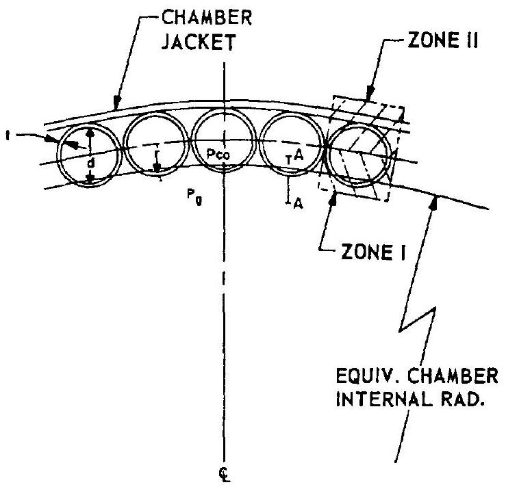 As a general design aid, figures 4-31 and 4-32 present construction detail for a typical regeneratively cooled thrust chamber. The chamber shown is very similar to the one presented in figures and . Figure 4-31 shows clearly how the tube shape changes along the longitudinal axis. In a typical manufacturing process, tubes of uniform circular cross-section area are first cut to length, then swaged. The latter operation can best be accomplished by internal hydraulic pressure in a die. The tubes are filled with was, and are then bent (preshaped), in a special fixture, to the thrust-chamber contour.