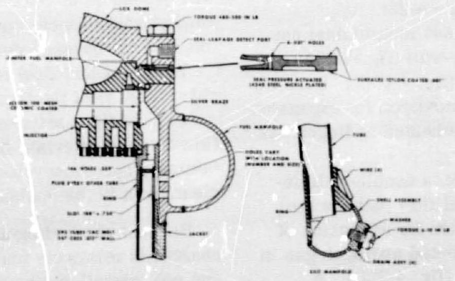 Figure 4-32.-Detail of injector manifolding and return manifold of typical regeneratively cooled tube wall thrust chamber.