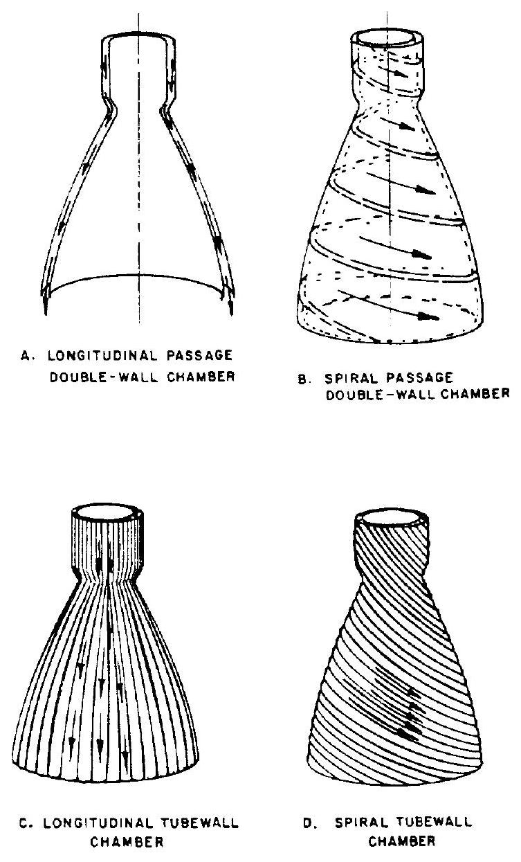 - Regenerative cooling.-Regenerative cooling is the most widely applied method and utilizes one or possibly both of the propellants, fed through passages in the thrust chamber wall for cooling, before they are injected into the combustion chamber. (See par. 4.1 and fig. 4-1.)