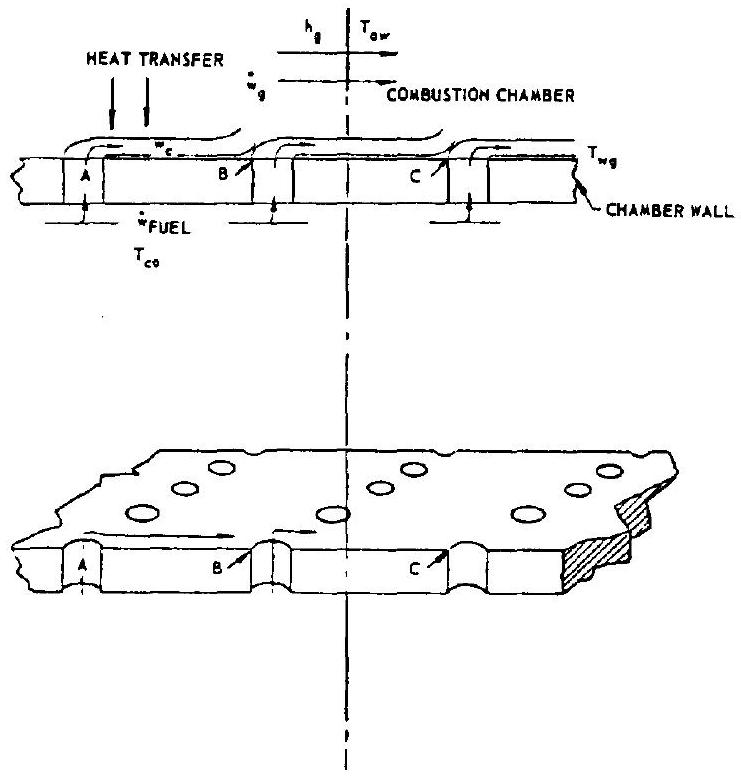 Figure 4-26.-Heat transfer schematic for regenerative cooling.