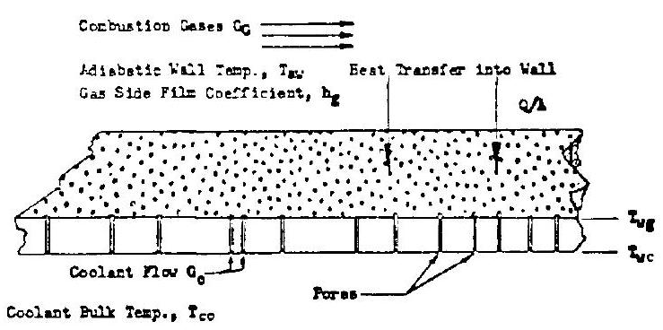- Transpiration cooling.-Transpiration cooling is accomplished by introducing a coolant (either gaseous or liquid propellants) through porous chamber walls at a rate sufficient to maintain the desired combustion gas side chamber wall temperature. This method is essentially a special type of film cooling and has been widely used.