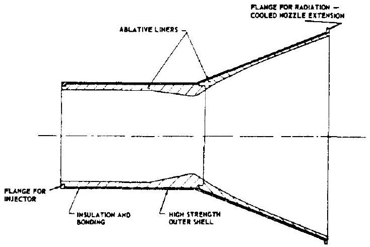 Ablatively cooled thrust chambers have many advantages for upper-stage applications. They are designed to meet accumulated duration requirements varying from a few seconds to many minutes. Most designs are limited to lower chamber pressure applications, 300 psia or less. When assisted by film cooling, or by throat inserts made from refractory materials, successful firings have been made up to a chamber pressure level of 1000 psia . In general, ablative chamber construction is rugged, exterior wall temperatures are held to a minimum and the cost is low.