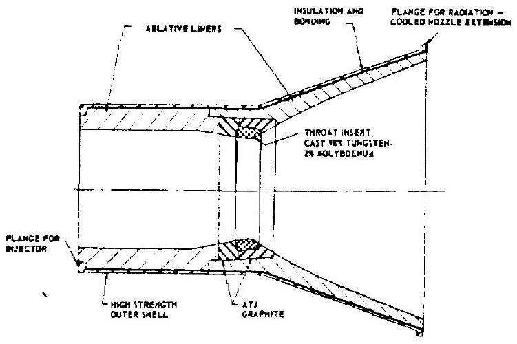 Figure 4-38 shows an ablative-cooled thrust chamber fitted with a throat insert. Both 98 percent tungsten/2-percent molybdenum alloy and pyrolytic graphite have been successfully employed as insert materials. The tungstenmolybdenum alloy has given the best results. Although pyrolytic graphite has a much lower density than tungsten alloy, and therefore has a substantial weight advantage, it is vulnerable to fracture from thermal shock, making design and installation critical. The throat insert is installed with heavy graphite backups for better structural results. Insert and backups are bonded to the thrust chamber main ablative liner with epoxy adhesives. These adhesives have performed satisfactorily up to . Certain ceramic materials, such as silicon carbide, also have been used successfully as throat inserts in space engine applications.