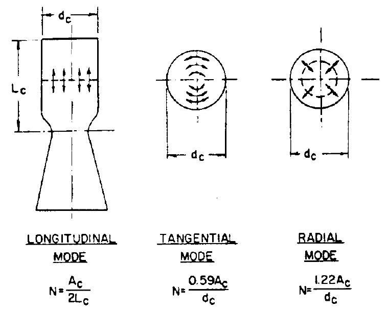 Figure 4-59.-Three modes of instability. combustion chamber length (injector face to throat); combustion chamber diameter; normal acoustic frequency; velocity of sound in chamber.