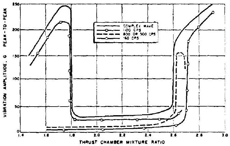 of combustion, and the dynamics of the combustion gases in the chamber. It has been found that each of the frequency components in the instability spectrum of a thrust chamber is predominantly influenced by only one physical process so that it is possible to group the observed instabilities in broad general classes, which are: high frequency or gas dynamics, low frequency or hydrodynamics, and intermediate frequency or combustion dynamics, listed in the order of their relative importance. Figure 4-60 presents vibration amplitudes of various frequencies versus mixture ratio of a typical RP-1 engine at the 150000 -pound thrust level. The graph indicates the large difference in vibration amplitude between a stable and an unstable region.