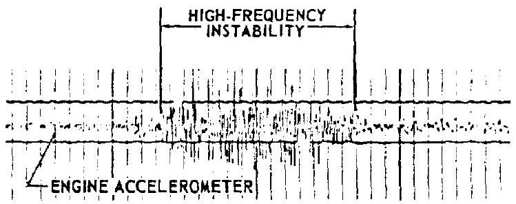 In many systems extremely unpredictable high-frequency instability has occurred. It is often, but by no means always, connected with the buildup phase to main stage. Systems which ran stably during numerous successive tests can become unstable without warning or subsequent clear indication of a cause. Figure 4-61 shows the starting of a typical high-frequency instability, indicated by the sudden shift in the accelerometer trace due to high-amplitude chamber pressure oscillations. All types of rocket propulsion systems, including solid systems, have been plagued by high-frequency instability. A considerable amount of research and engineering has been devoted to the explanation and elimination of this phenomenon.
