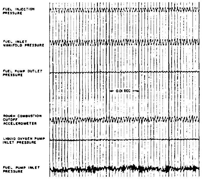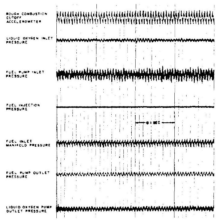 This type of instability, at frequencies below approximately 180 cps , is a hydrodynamic oscillation, characterized by a cause-and-effect-type coupling between combustion process and propellant feed system flow processes. The phenomenon is sometimes referred to as "chugging." Its secondary effects can be serious indeed. "Chugging" may trigger destructive high-frequency instability. Also, prolonged chugging can lead to loosening of bolts and other vital connections and to ruptures in general. Low-frequency instability is self-sustaining but may damp out. As a rule, it is predictable from analytical and from test result studies. In figure the high-speed-pressure instrumentation measurements indicating chugging clearly show that the oscillations of propellant feed system pressures are at the same frequency as the "rough combustion cutoff accelerometer" reading.