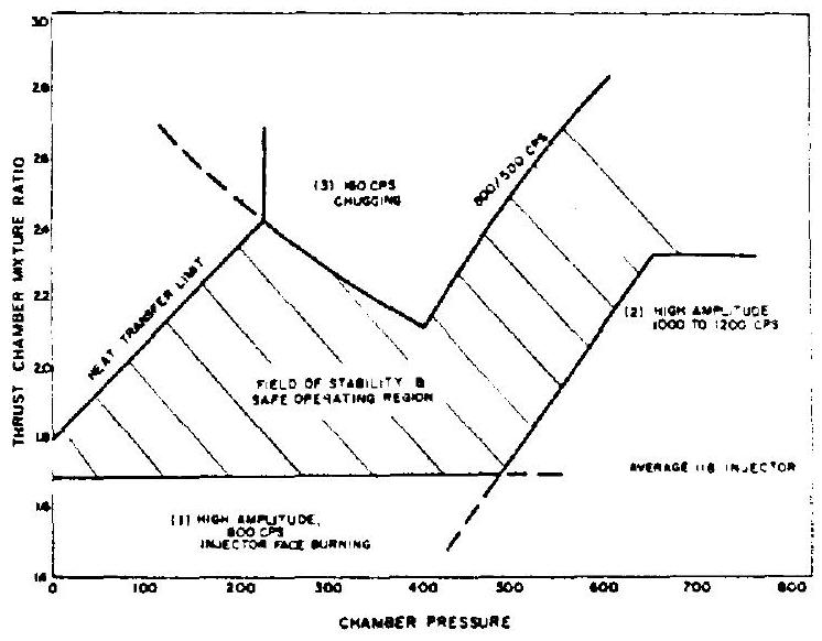 For a given engine system, combustion stability limits can be defined experimentally in terms of certain operational parameters such as chamber pressure, injection , and mixture ratio. Figure 4-64 presents the stability field for a typical -pound nominal thrust engine system. The stability field, together with heat transfer limits, can serve as a guide to the design of a safely operating engine system.