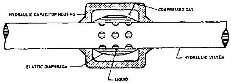 - Feed system hydraulic capacitor.-Selfsustained combustion and feed system instabilties of the buzzing type can be eliminated by introducing hydraulic capacitors in the feed system. A hydraulic capacitor is any device which will increase the effective compressibility at a given point in the liquid system. Figure 4-65 shows the schematic of an experimental hydraulic capacitor. It is an isolation-type capacitor with large capacitance and zero resistance between it and the system. Its function is to isolate the transmission of pressure disturbances through the system above a given frequency. Another type is called absorption capacitor, which has small capacitance and high resistance between it and the system. Its function is to absorb the oscillatory energy of the system by damping or attenuating the resonant frequencies of the system.