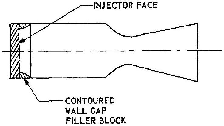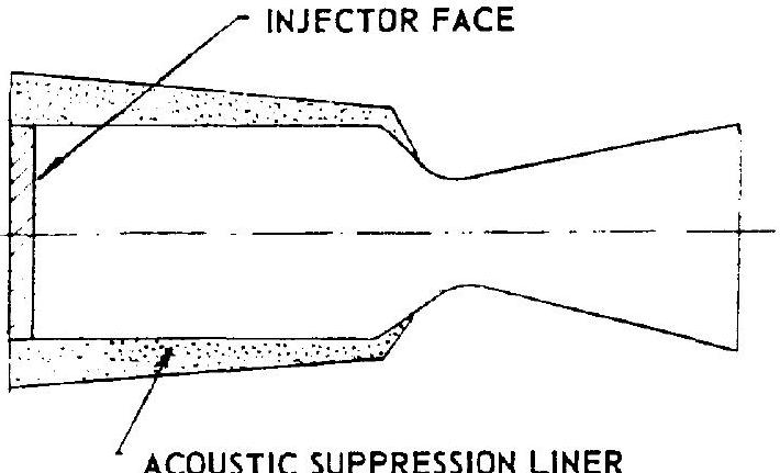 the most effective method of suppressing transverse acoustic modes of combustion instability. This has been demonstrated in both full-scale thrust chamber and small-scale models, operating with various propellant combinations. These baffles are usually designed to be secured to the injector face as shown in figure 4-40. Adequate cooling means should be provided to keep the baffles from burnout. The depth or height of the baffles is a function of the distance of the combustion-flame front from the injector face. Experimental evaluations should be conducted to support the design and development effort. 3. Chamber divergent wall gap.-It was found experimentally that leaving blank an annular portion of the propellant injection area adjacent to the combustion chamber wall, as shown in figure 4-66, improved the capability of the combustion chamber to recover from triggered instabilities. It was further determined that by filling this "wall gap" with a contoured filler block, "dynamic stability" could be drastically improved in most cases. The exact shape of the contour is critical, and experimental evaluations are required to determine the most effective design configuration. 4. Acoustic chamber liners.-The feasibility of using resonant and nonresonant acoustic suppressing liners on the combination chamber walls has been demonstrated in turbojet engine applications. In this case the principle of suppression is similar to the use of patches of acoustic tile to reduce the sound level in a room, whereby the energy absorbed from the mode will reduce its amplitude. Figure shows a typical arrangement. The combined area of the suppressor openings must be of the order of from 3