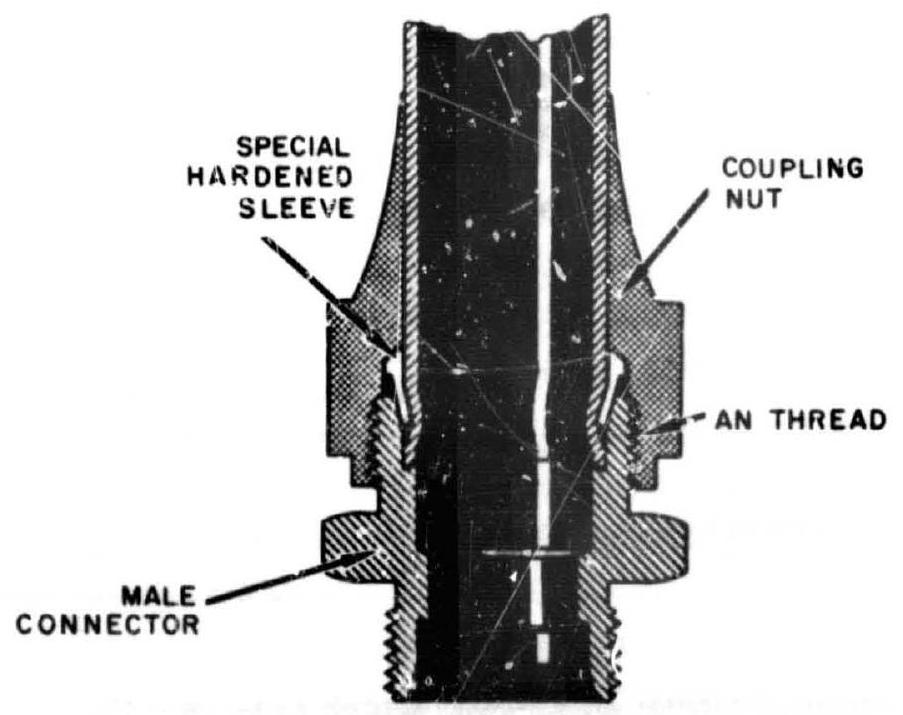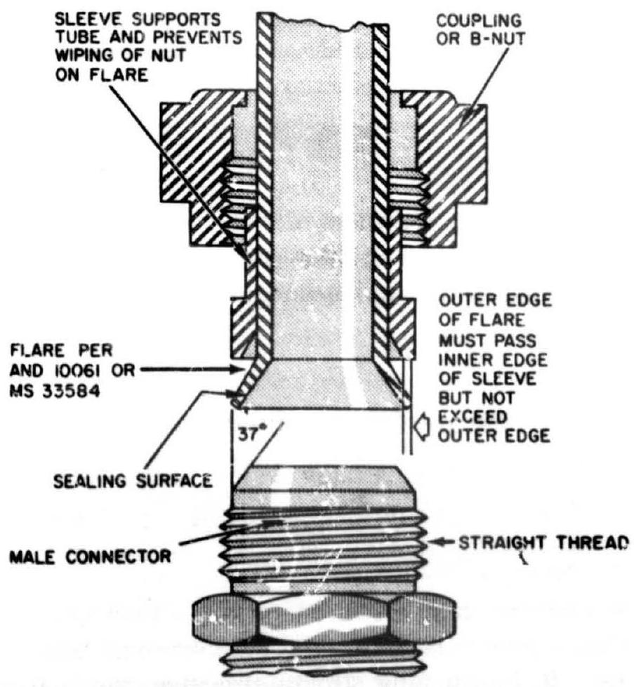 The angle of flare of the fitting was established at 3737^{\circ} to give maximum flare contact and provide a nose sufficiently strong to resist crushing. The AN three-piece fitting consists of a coupling nut (AN818), a sleeve (AN819), and a connector. The sealing occurs between the nose of the fitting connector and the inside of the tube flare. The AN819 sleeve has an external shoulder against which the AN818 nut acts. This produces a locking effect on the nut, as the sleeve is slightly sprung upon proper torque. The sleeve is free to turn during initial assembly to allow for slight eccentricity of the tubing or the nose of the fitting connector.