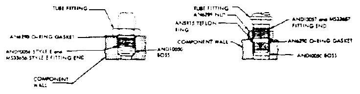 The boss design for engine components, to connect AN tube fittings, is specified by AND10050. Figure 9-9 illustrates typical installation of tube fitting ends into the AND10050 boss.