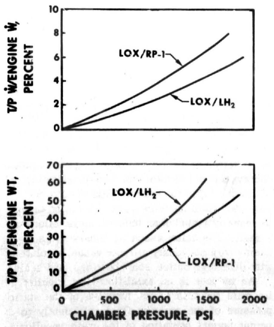 larly with the intoduction of bigh-performance hydrogen-fueled engines. As shown in figure 6-1 for two propellant combinations, the proportional turbopump-assembly weight in an engine system rises with increasing chamber pressure, as does the required turbopump power expressed as a percentage of total engine propellant flow rate.