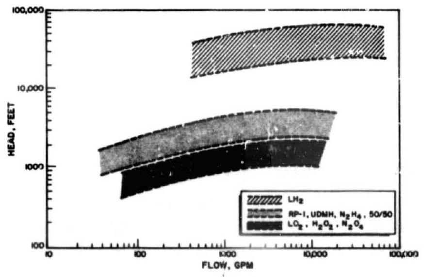 A representative range of pump operating parameters for various liquid propellant rocket engine applications is shown in figure 6-2. Figure 6-3 depicts an envelope of turbine power requirements for a number of actual turbine designs.