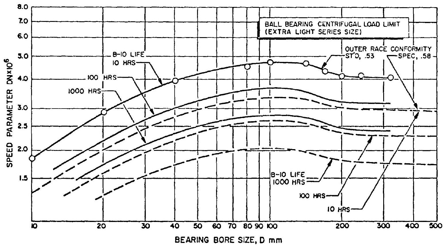 Figure 6-61 presents the centrifugal load DND N limits in terms of 10,100 , and 1000 hours of B-10 life for a typical ball bearing design (extralight series).