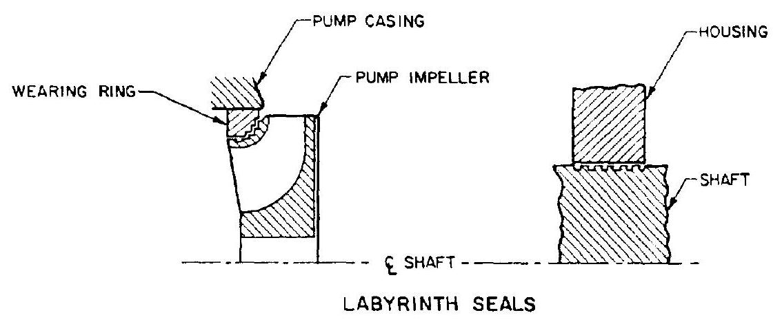 where Qe=Q_{e}= leakage rate, in3/sec\mathrm{in}^{3} / \mathrm{sec} Ac=A_{c}= seal clearance area, in 2{ }^{2} Δps=\Delta p_{s}= pressure differential across the seal, lb/in2\mathrm{lb} / \mathrm{in}^{2} ρ=\rho= density of the fluid lb/in3\mathrm{lb} / \mathrm{in}^{3} Cs=C_{s}= seal leakage coefficient, established experimentally Labyrinth seals are used for the wearing rings of pump impellers, as well as for the rotating seals attached to the sealing diaphragm between two turbine stages.