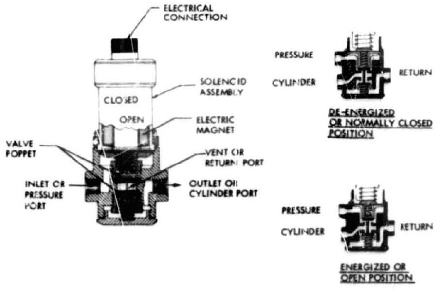 Solenoid actuators are usually applied to the sliding stem of pilot valve poppets, for on-off, two-position operation (figs. 7-44, 7-45, and 7-48). Solenoids are electromagnets, containing an armature or plunger which moves in a coil of wire. When the coil is energized, a magnetic force is exerted on the plunger. The magnitude of the force is proportional to the cross-sectional area of the plunger, the number of the coil turns, the electric current applied to the coil, and the gap between plunger and core. It increases as the gap narrows.