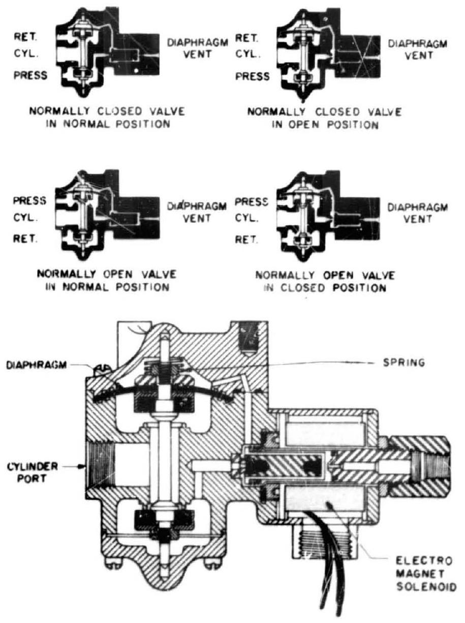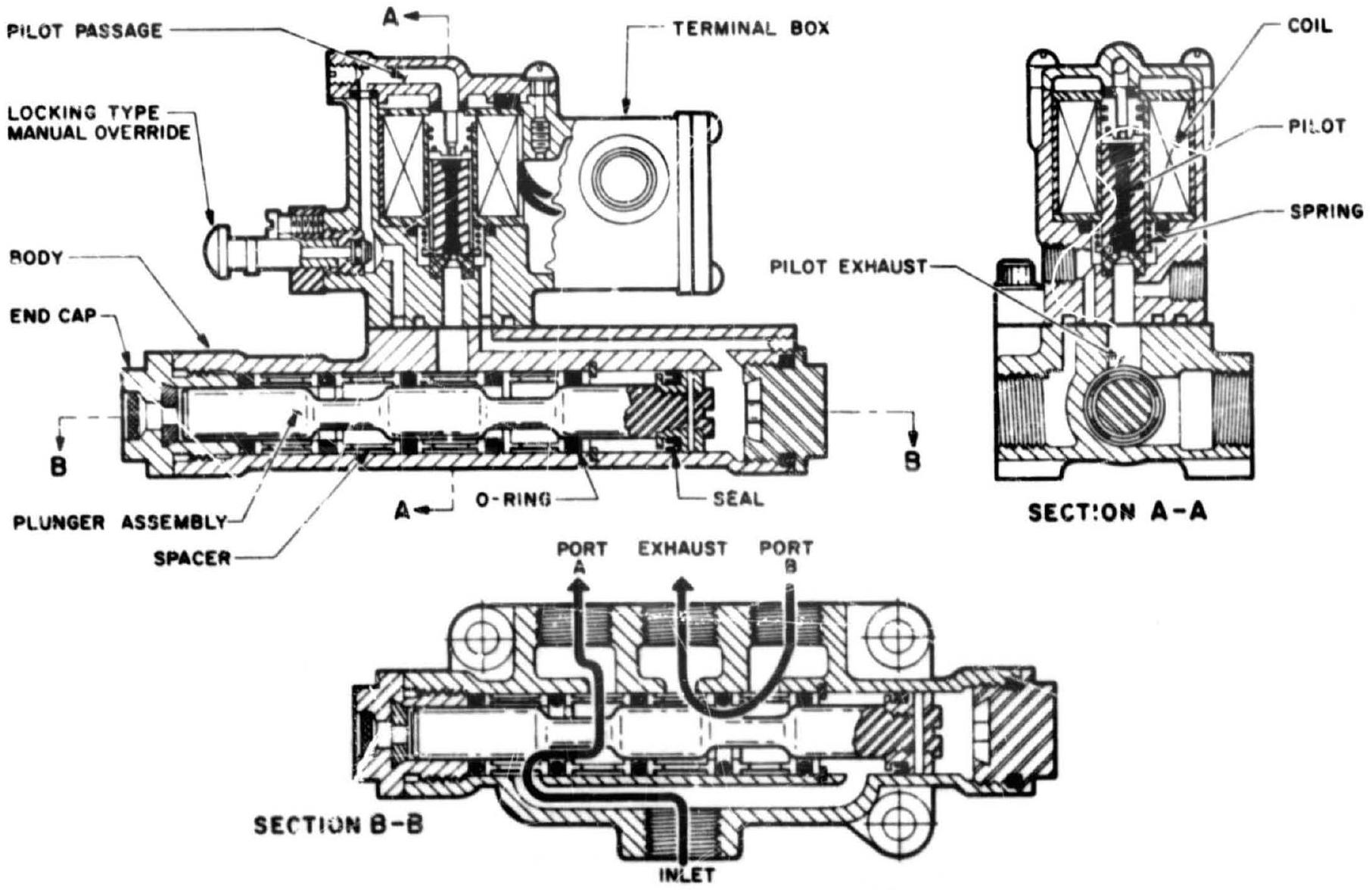 The typical design of a pilot-operated fourway solenoid pilot valve, developed by Valvair, is shown in figure 7-48. This valve type is used to control pneumatic actuators.