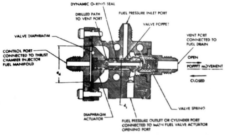 A typical fluid-pressure-actuated, three-way pilot valve design is shown in figure 7-46. This valve may be used as the ignition monitor valve in the A-1 stage engine control system. The valve is held normally closed by a spring. The valve diaphragm is designed as a combined sensing and actuating diaphragm. During engine start and when satisfactory main thrust chamber ignition has been achieved, the pressure bu ldup sensed at the thrust chamber injector fuel manifold will cause the ignition monitor valve to open