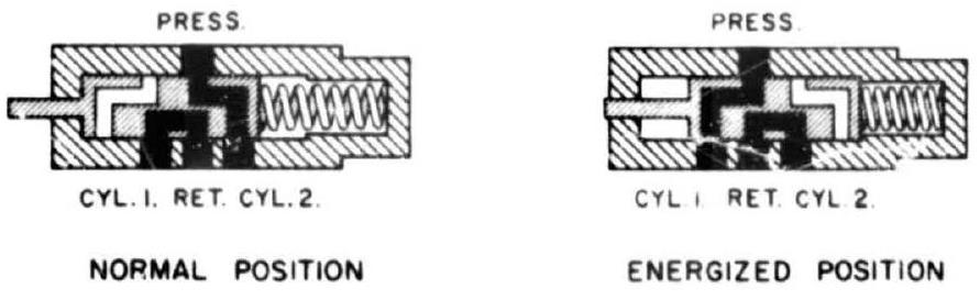 A three-way pilot valve (fig. 7-44) has three ports: inlet or pressure port, outiet or cylinder (actuator) port, and vent or return port. If the valve is designed normally closed (N.C.), the fluid path between pressure and cylinder ports is closed, while the path between cylinder and return ports is open. Actuation of the valve effects closing of one fluid path and opening of the other. The reverse is true for a normally open (N.O.) valve; i.e., the fluid path between pressure and cylinder ports is normally open.