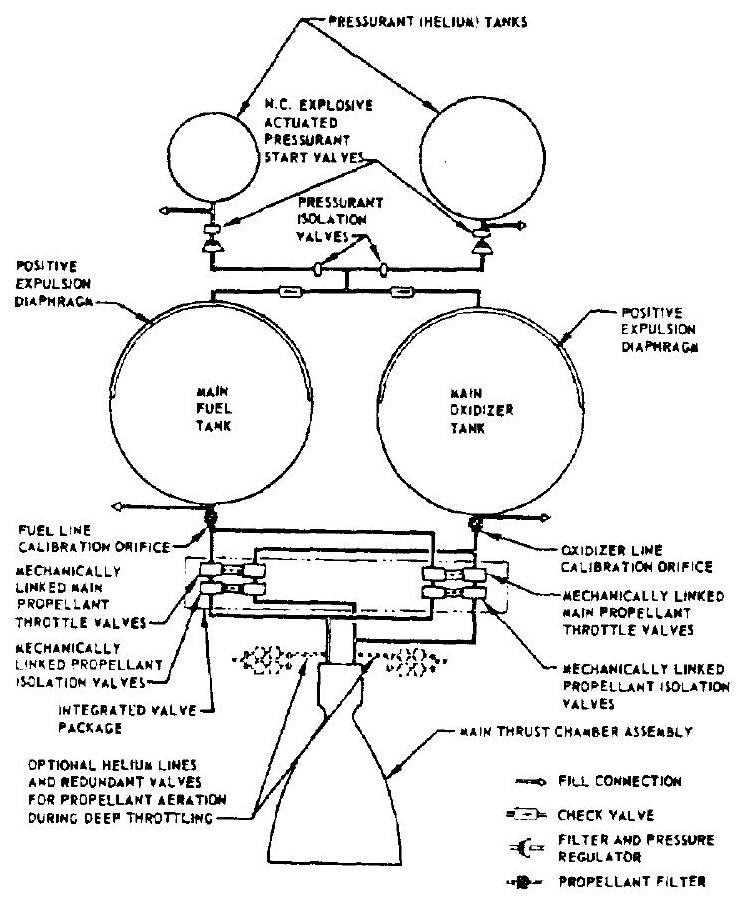The reliability requirements for space missions have led to simple, stored inert gas pressure feed main propulsion systems (fig. 5-1), using conventional hypergolic Earth-storable propellants and redundant control components. For tube connections, the trend is to welded or brazed joints, with flexibility provided either by braided metal hoses or metal bellows. Integrated engine packages are preferred, consisting of thrust chamber and injector assembly, integrated propellant control valve package, and flight instrumentation. Besides meeting thrust and performance specifications, principal system design requirements for a spacecraft main engine are: (1) High reliability and crew safety (through redundancy in the control system; use of proven design concepts, materials, and fabrication techniques; and extended life and overstress testing) (2) High combustion stability rating with respect to perturbations during start and throttle transients (3) Capability of numerous starts, with repeatable cutoff impulse (4) Capability of deep throttling (optional, not required by all missions), with simple controls (5) Capability of propellant utilization and tank blowdown (ullage expansion) (6) One signal each, for start and cutoff (7) No purge, bleed, or lubrication equipment required (8) Effective isolation of the propellants from the system during long coast periods (use of propellant isolation valves) (9) System growth potential and flexibility to mission modifications (10) Sufficient protection against the effects of heat, nuclear radiation, and meteoric bombardment.