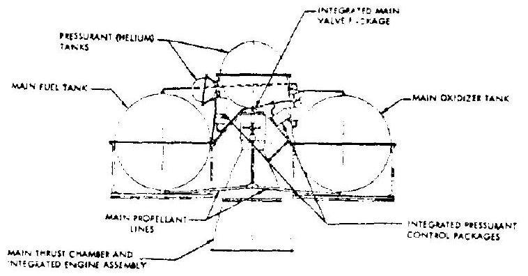 The package design layout of the pressurefeed spacecraft main propulsion system schematically illustrated in figure 11-5 is shown in figure 11-6. The integrated main valve package is mounted directly to the main thrust chamber assembly, immediately upstream of the injector. The integrated engine assembly can be either rigidly mounted, or gimbal mounted, depending on requirements. Lightweight spherical propellant and pressurant tanks are secured by simple frames. An all-welded and brazed construction is employed for system assembly to prevent external leakage of pressurant gas or propellant.