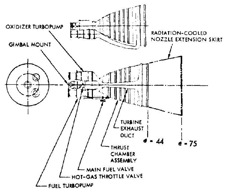 propellant combination. The main thrust chamber is regeneratively cooled by the fuel to a nominal nozzle expansion area ratio of 44:1. A radiation-cooled nozzle extension skirt may be added for certain missions to yield an overall expansion area ratio of . The propellants are supplied to the main chamber by two separate turbopump assemblies which are mounted to the thrust chamber body, resulting in an integral, compact engine. The turbines are driven by gases bled from the main combustion chamber in a parallel arrangement (fig. 6-13). A hot-gas throttle valve (such as shown in fig. 7-31) located upstream of the turbine inlets controls the turbine power, and thus the thrust level. A Y-type hot-gas duct is used to route the turbine exhausts into the main chamber nozzle. The entire engine package can be gimbaled at the gimbal mount by linear gimbal actuators.
