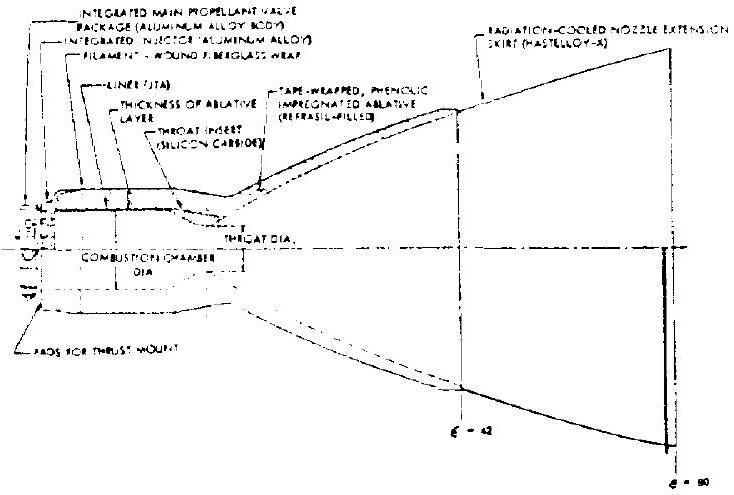Earth-storable propellants at a chamber pressure of 125 psia. Refrasil-filled, phenolic-impregnated ablative materials are tape wrapped on a mandrel, at the combustion chamber and nozzle sections, up to an expansion ratio of 42 . A JTA liner and a silicon carbide insert are provided for combustion chamber section and throat, respectively. The chamber outer wall is made of fiber-glass filament, wound to accept hoop stresses, and then wrapped longitudinally (helically) to contend with meridional stresses. An insulating layer, consisting of the basic or another ablative material such as asbestos or alumina silica, is wrapped around the basic ablative layer and cured to reduce the rate of heat flux to the structural fiber-glass outer wall. A radiation-cooled skirt made of Hastelloy-X sheet is tape wrapped to the thrust chamber nozzle to provide the nozzle extension from an expansion ratio of to . An integrated injector is attached to the end of the combustion chamber and is made of an aluminumalloy forging. It is a conventional, fixed-orifice, single-ring, unlike-impinging doublet type.
