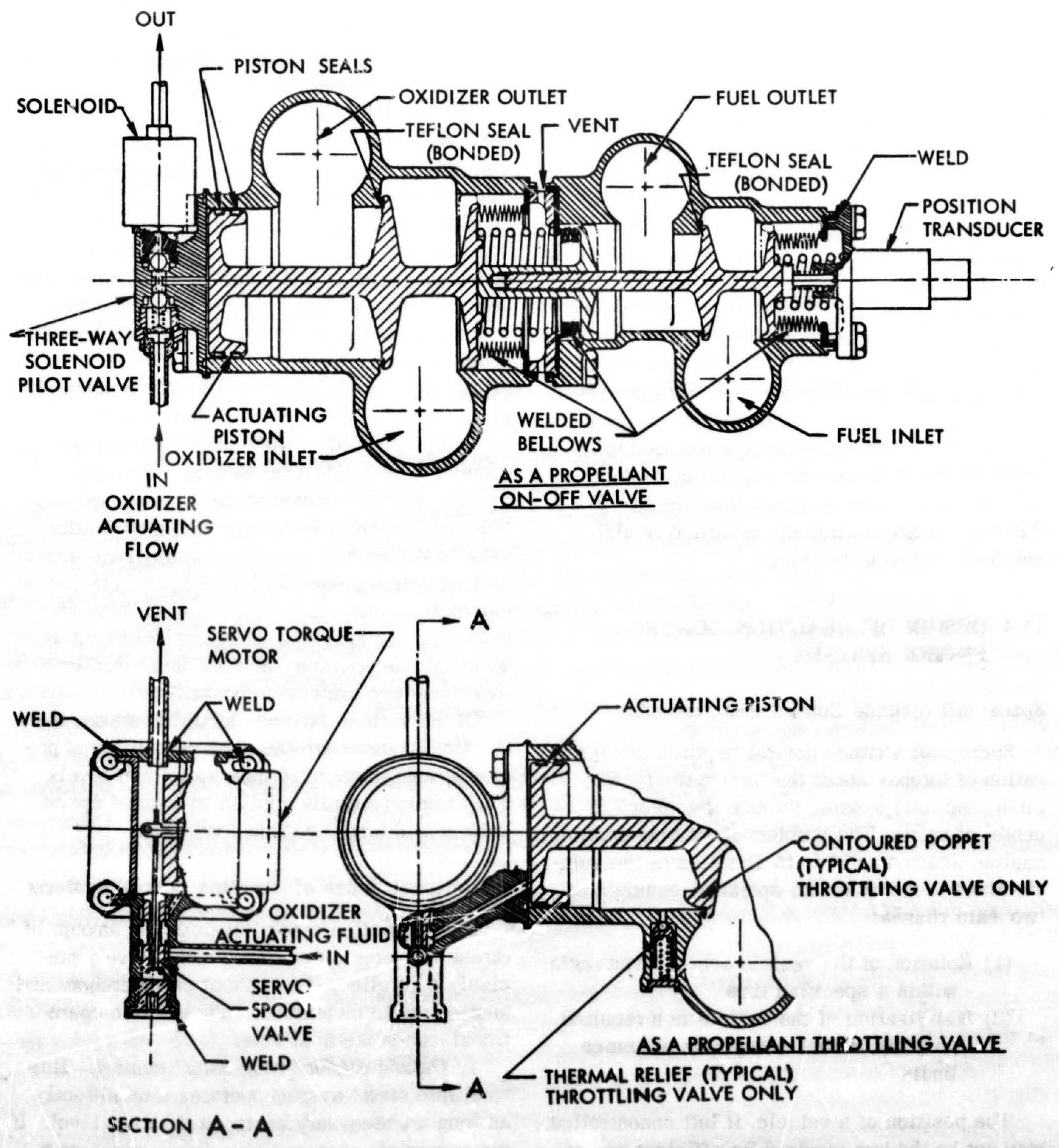 Figure 11-9.-Typical mechanically linked, poppet-type, dual-propellant on-off or throttling valve, for spacecraft main propulsion systems using hypergolic Earth-storable propellants.