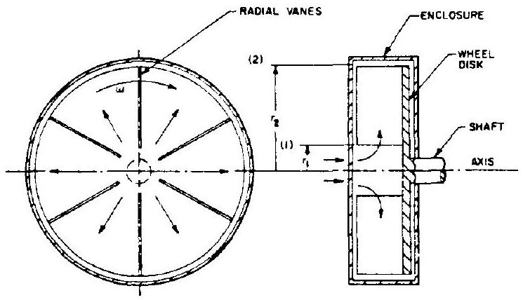 In its simplest form, the impeller of a centrifugal pump can be regarded as a paddle wheel with radial vanes, rotating in an enclosure, with the fluid being admitted axially and ejected at the periphery. This is shown schematically in figure 6-33. The tangential velocity component of each fluid element increases as it moves out radially between the vanes. Therefore, the centrifugal force acting on these fluid elements increases as the fluid moves out radially. Assuming constant flow velocity in the radial direction and no energy losses, the ideal head rise due to centrifugal force between the central entrance (1) and the peripheral exit (2) is