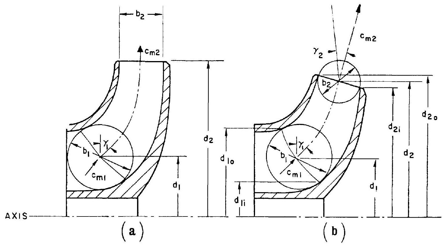 d2i=d_{2 i}= inner vane diameter at the discharge, in Effective impeller widths at inlet and discharge, b1b_{1} and b2b_{2}, are also presented in figure 6-38 aa and bb. They are equal to the diameter of a circle which is tangent to the contours of both front and back shrouds. γ\gamma is the angle between the meridional flow vectors ( cm1c_{m_{1}} and cm2c_{m_{2}} ) and the plane normal to the axis of rotation. It is also the angle between the plane of the velocity diagrams and the plane normal to the axis. The value of γ\gamma varies along the flow passage. The layout of a mixed-flow impeller on the drawing board is a rather complicated drafting problem. This is due to the three-dimensional vane curvature and other complexities. The method of "error triangles" suggested by Kaplan may be used. Details of this method can be found in standard pump reference books.