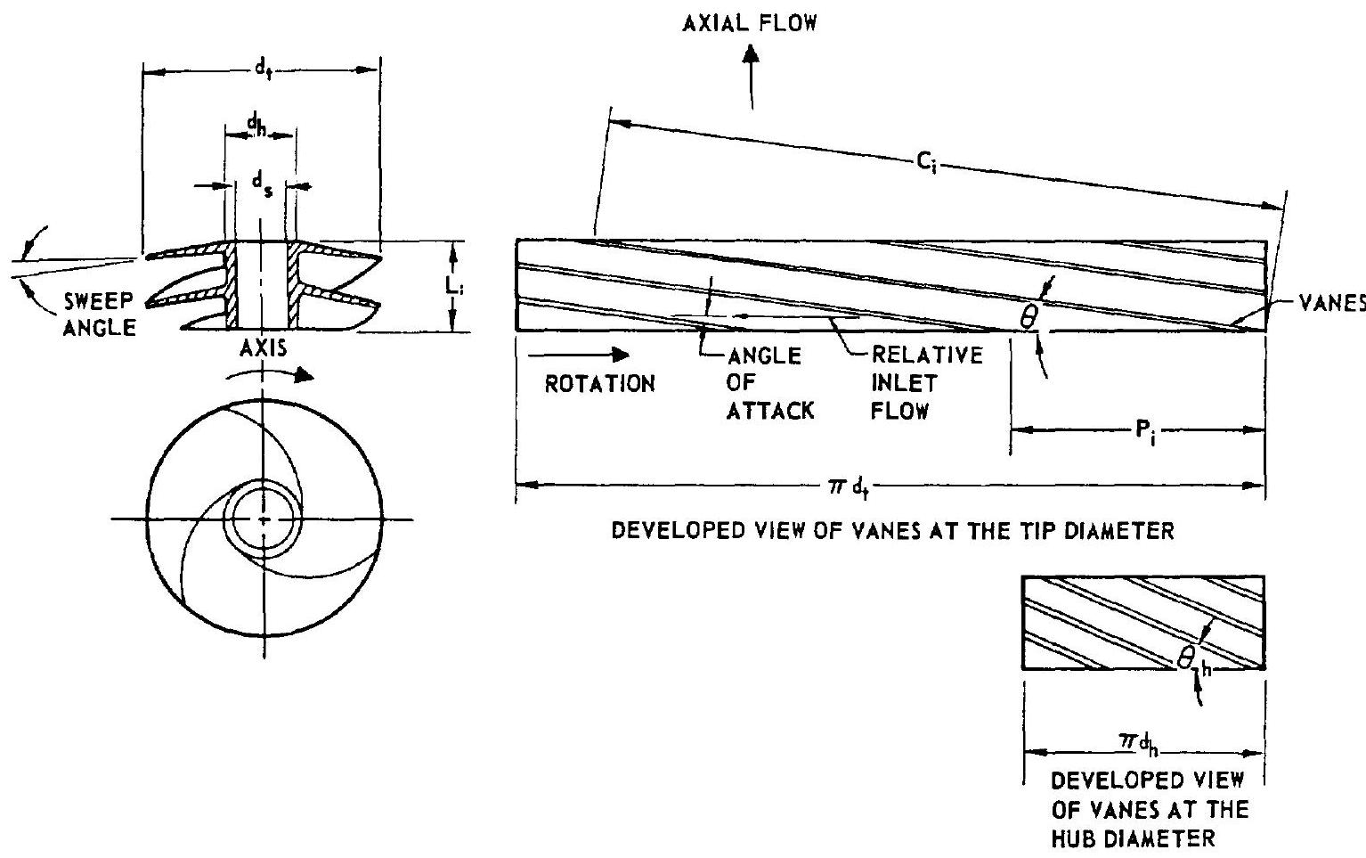 Figure 6-39 presents the basic elements of a typical inducer design. The primary increase in static pressure occurs at the leading (upstream) edge of the vane through free stream diffusion: i.e., through a reduction of relative speed and by operating at a small angle of attack between relative inlet flow and inducer inlet vane. The cavitation performance of an inducer depends strongly on the inlet flow coefficient ϕind \phi_{\text {ind }} (ratio of inlet axial flow velocity cmo c_{\text {mo }} to inlet tip speed uotu_{o t} ). To obtain high suction specific speeds (for highest pump speed NN ), the inducer must have a low flow coefficient. This results in small angles ( θt,θh\theta_{t}, \theta_{h} ) between vanes and the plane normal to the axis of rotation. As a rule, the inducer vane angle θ\theta varies radially according to a constant
