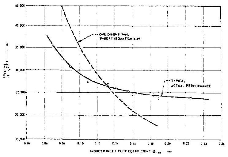 The cavitating inducer of a centrifugal propellant pump is a lightly loaded axial-flow impeller operating in series with the main pump impeller as shown in figure 6-5. The term "cavitating" refers to the fact that the inducer is capable of operating over a relatively broad range of incipient cavitation prior to a noticeable pump head dropoff. It produces from 5 to 20 percent of the total head rise of a pump. The conditions of pump critical NPSH at the 2-percent dropoff point may correspond to a 10 - to 30 percent inducer-developed-head reduction, depending upon its match to the main pump impeller. The required inducer head rise for a given design is expressed by the correlation