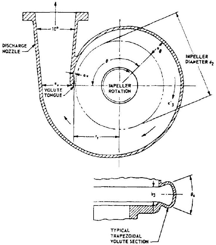 where c3=c_{3}{ }^{\prime}= average flow velocity in the volute, ft/sec\mathrm{ft} / \mathrm{sec} Q=Q= rated design pump flow rate, gpm aV=\mathrm{a}_{V}= area of the volute throat section, in 2{ }^{2} aθ=\mathrm{a}_{\theta}= area of a volute section ( in2\mathrm{in}^{2} ), at an angular location θ\theta (degrees) from the tongue