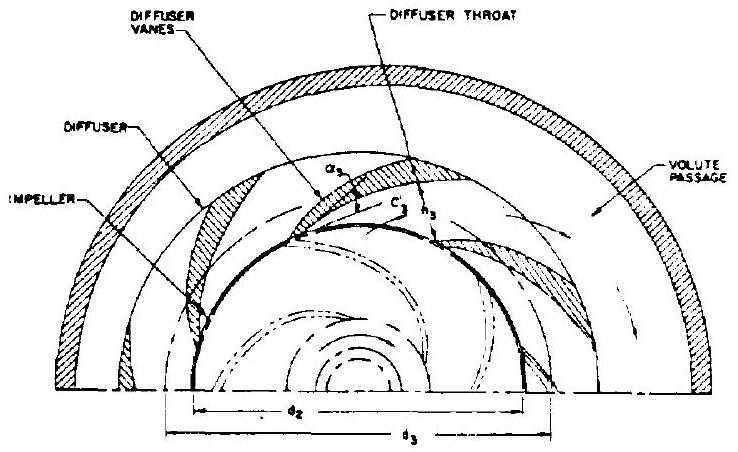 The diffusing vane volute has essentially the same shape as a plain volute, except that a number of passages are used rather than one. This permits the conversion of kinetic energy to pressure in a much smaller space. The radial clearance between impeller and diffuser inlet vane tips should be narrow for best efficiency. Typical values range from 0.03 to 0.12 inch, depending upon impeller size. The width of the diffuser at