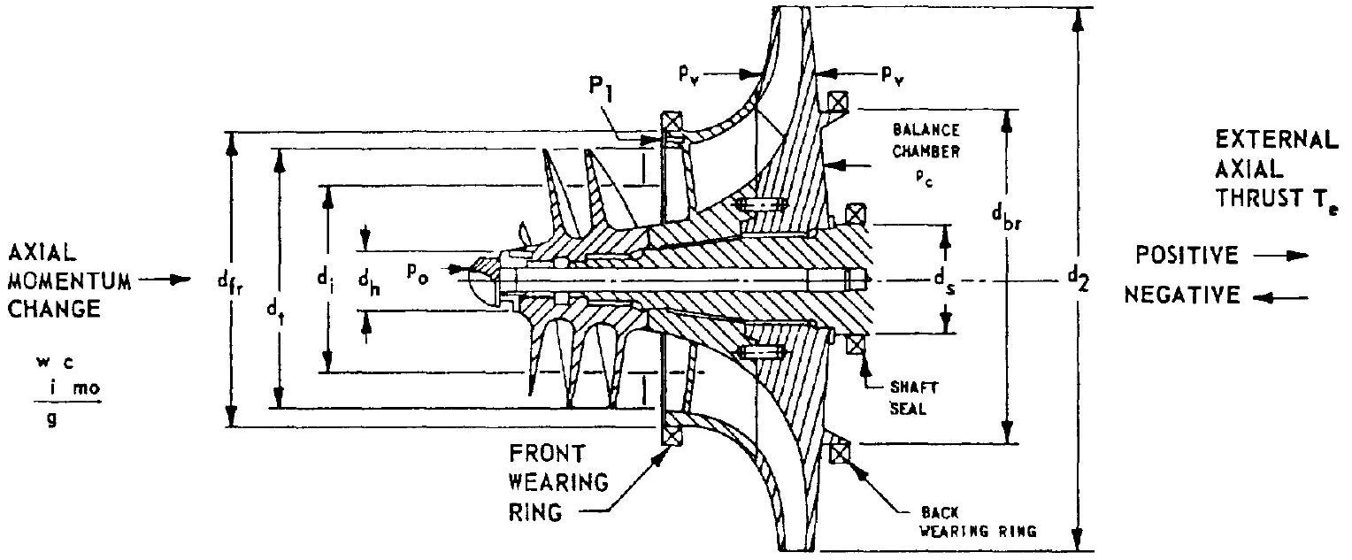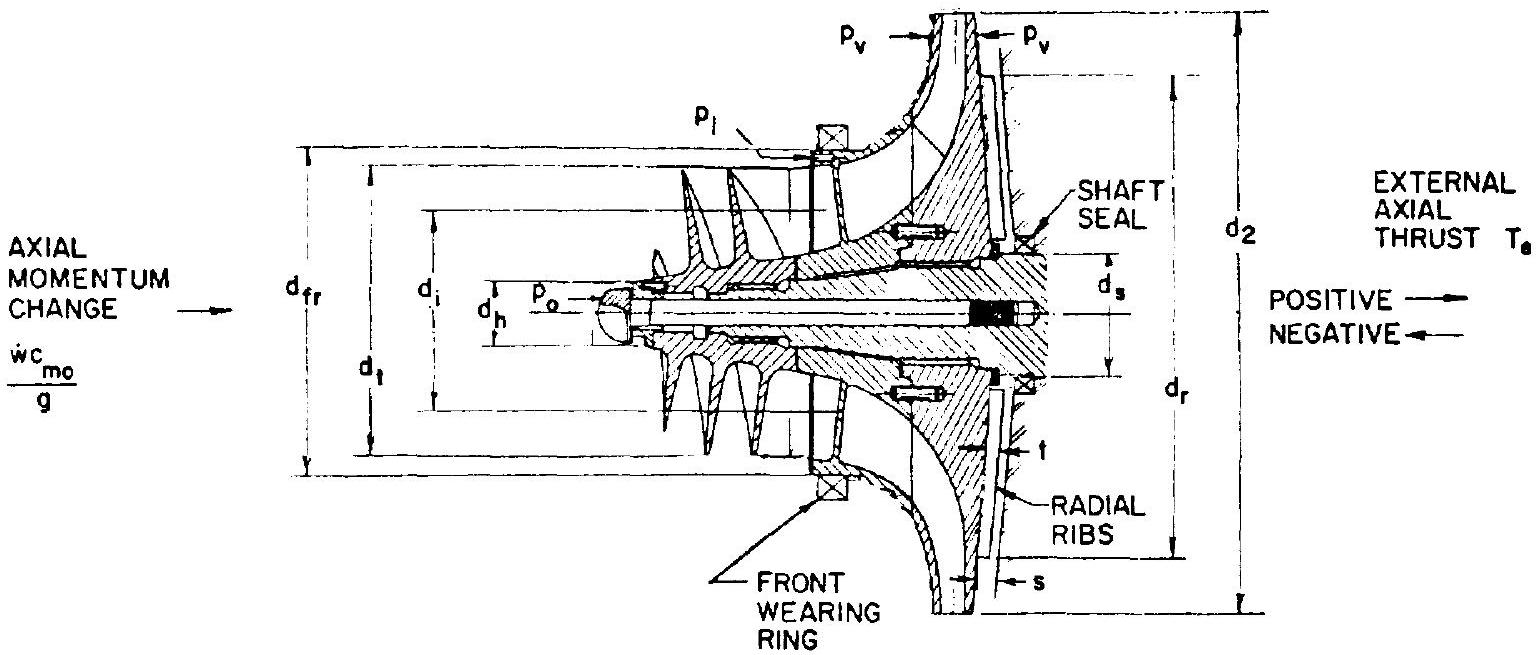 where pc=p_{c}= balance chamber pressure, psia pv=p_{v}= average net pressure in the space between impeller shrouds and casing walls, psia p1=p_{1}= static pressure at the inducer outlet, psia p0=p_{0}= static pressure at the inducer inlet, psia ds=d_{s}= effective shaft seal diameter, in dh=d_{h}= hub diameter at the inducer inlet, in dt=d_{t}= inducer tip diameter=eye diameter at the impeller inlet, in dtr=d_{t r}= front wearing ring diameter, in dbr=d_{b r}= back wearing ring diameter, in w˙i=\dot{w}_{i}= inducer weight flow rate, lb/sec\mathrm{lb} / \mathrm{sec} cm0=c_{m 0}= axial flow velocity at the inducer inlet, ft/sec\mathrm{ft} / \mathrm{sec} (converts to radial) gg = gravitational constant, 32.2ft/sec232.2 \mathrm{ft} / \mathrm{sec}^{2} Te=T_{e}= external axial thrust due to unbalanced axial loads of the other propellant and/or the turbine; lb. A positive sign indicates a force which tends to pull the impeller away from the suction side, a negative sign indicates the opposite. The static pressure at the inducer outlet, pip_{i}, can be either measured in actual tests, or approximated by