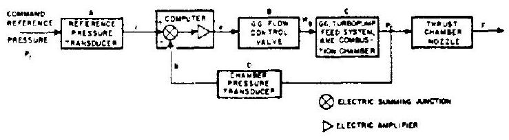 (electric summing junction and amplifier), and a controller (gas generator flow control valve), the command reference input is compared with the sensor feedback . The controller then manipulates in response to an error signal from the computer. Ideally, should be in linear proportion to and to , save for constants required to convert one physical quantity into the other. However, this ideal condition is difficult to attain because of the dynamic characteristics of the pressure transducers. These characteristics are influenced by physical properties such as mass inertia, fluid compressibility and viscosity, and frictional resistance. Instead of being directly proportional to , the two parameters are actually related through a differential equation which represents the dynamic behavior of the elements involved. The same is true for the feedback and the controlled variable . It is also applicable to other systems components. Hence, the analysis of a closed-loop control system usually involves the solution of sets of often complicated differential equations.