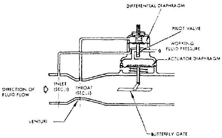 Figure 7-18 is the schematic of a typical closed-loop fluid-flow control system, in which the static pressure differential across a venturi is sensed and used to control fluid flow. The flow is regulated by means of a butterfly gate which is positioned by a fluid-powered actuator diaphragm. The working fluid pressure to the diaphragm is controlled by a pilot valve. Its position in turn is controlled by the pressure differential between venturi inlet (sec. 1) and throat (sec. 2). Because of the dynamic characteristics of the venturi sensing ports, diaphragms, springs, butterflies, and other parts, the relationship between flow rate and venturi pressure differential ( ) is not exactly linear. However, theoretical analyses usually permit good approximations of these dynamic functions. The empirical factors thus obtained will permit design calculations resulting in a reasonable degree of control accuracy. Flow-bench calibrations, including adjustments of, for instance. spring forces, serve to further increase this accuracy. The control of fluid flow and pressure by means of orifices and regulators will be further discussed in subsequent sections.