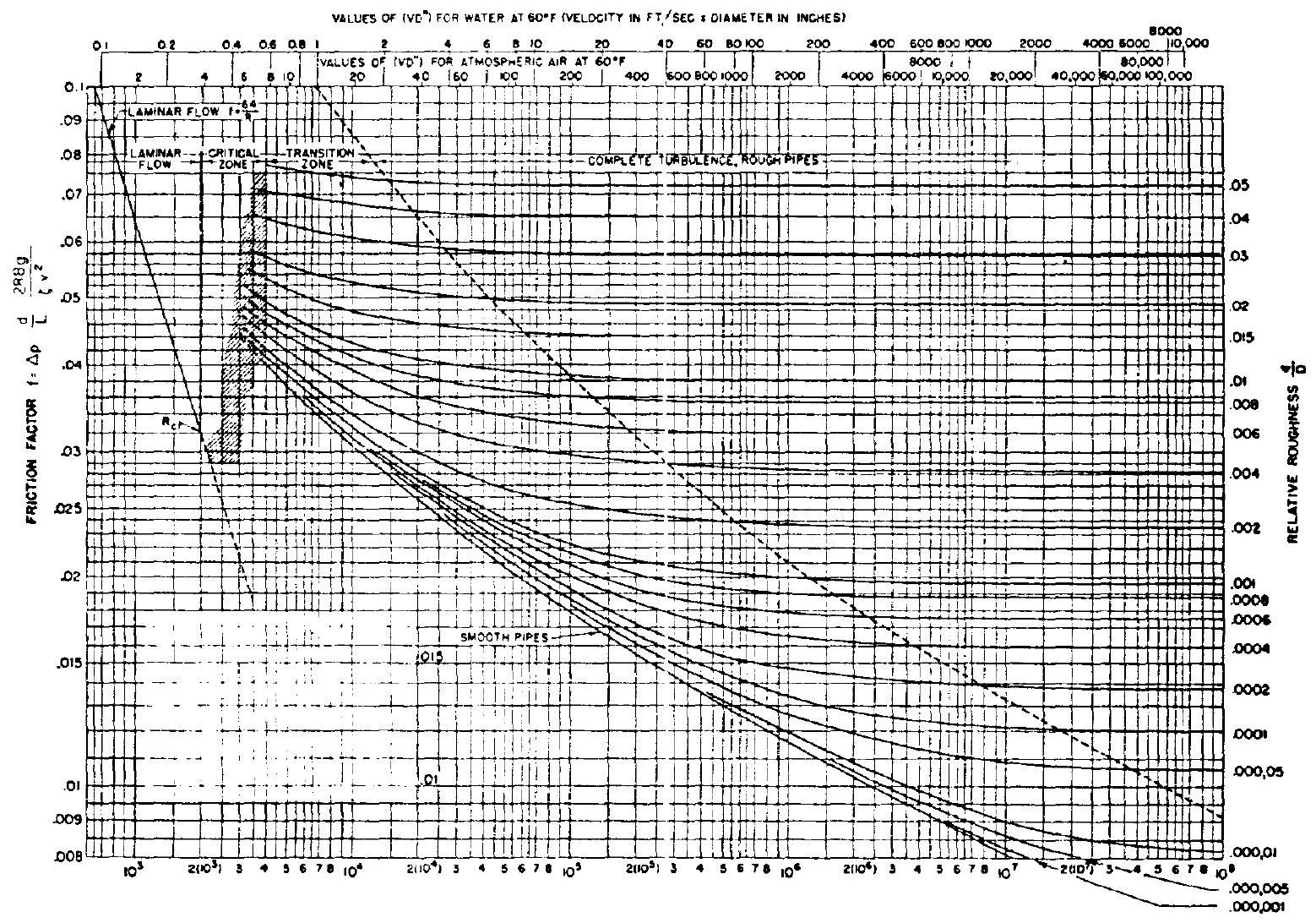 When the flow is turbulent ( ), the friction factor depends not only upon the Reynolds number but also upon the roughness of the duct or tube walls. The friction factors of turbulent flows may be found by means of the Moody diagram shown in figure 7-20. The dimensionless term, "relative roughness" ( ), is a measure of the size of the surface roughness projections relative to the duct diameter. Average values of surface roughness projections for rocket engine flow control components are given in table 7-3.